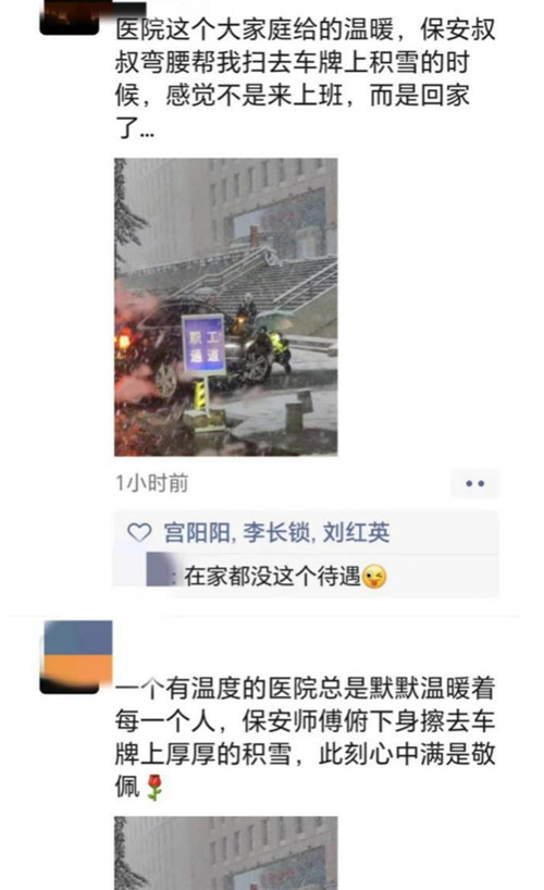 職工車輛進(jìn)入醫(yī)院地下停車場(chǎng)需要識(shí)別車牌,而積雪覆蓋了車身將車牌擋的嚴(yán)嚴(yán)實(shí)實(shí),造成系統(tǒng)無(wú)法識(shí)別,車輛入口處擁堵加劇。朝陽(yáng)分公司保安員張利輝見狀,就主動(dòng)俯身幫助入場(chǎng)車輛掃去車牌上的積雪,一次次俯身,一次次起立……反復(fù)的動(dòng)作中我們看不清他的樣貌,卻始終有那么一個(gè)身影在不停的揮舞著掃把為車輛掃去積雪,保證車輛有序快速入場(chǎng)。這一行動(dòng)溫暖了廣大員工的心,大家紛紛在微信朋友圈為他點(diǎn)贊。